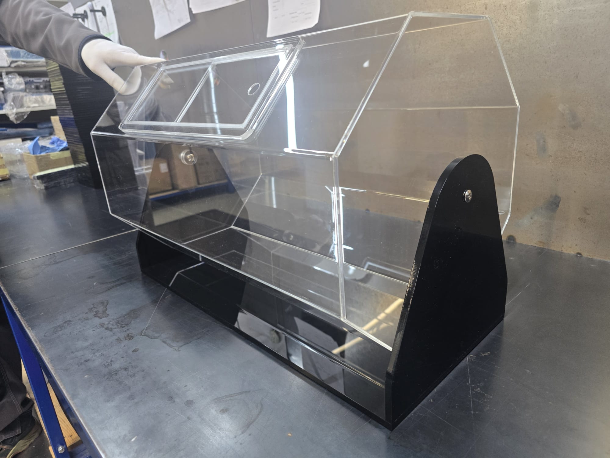 Caurspīdīgs izlozes cilindrs ar rotējošu mehānismu, izgatavots no kvalitatīva organiskā stikla. Piemērots loterijām, konkursiem, balvu izlozēm un pasākumiem, kur nepieciešama godīga un redzama izlozes procedūra. Cilindra durtiņas ar metāla aizdari nodrošina ērtu piekļuvi biļetēm vai kartītēm. Stabils, estētisks un praktisks risinājums publiskiem pasākumiem un komerciālai lietošanai.